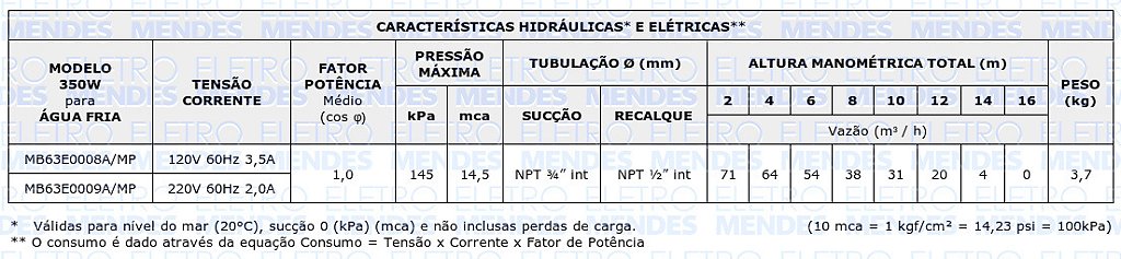 - Obs.: modelos MB63E0067A/MP, MB63E0068A/MP e MB63E0069A/MP, temperatura de operação da água: 5°C a 80°C.