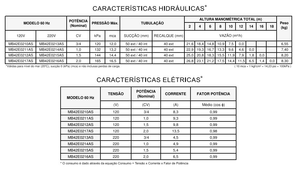 - Pressão máxima na sucção: 8 mca. (0,8 kgf/cm) (80kPa).