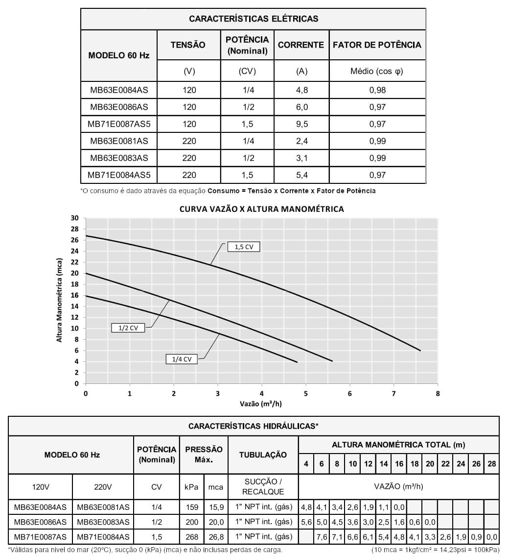 - Pressão máxima na succão: 8 mca (0,8 kgf/cm3) (80 kPa).